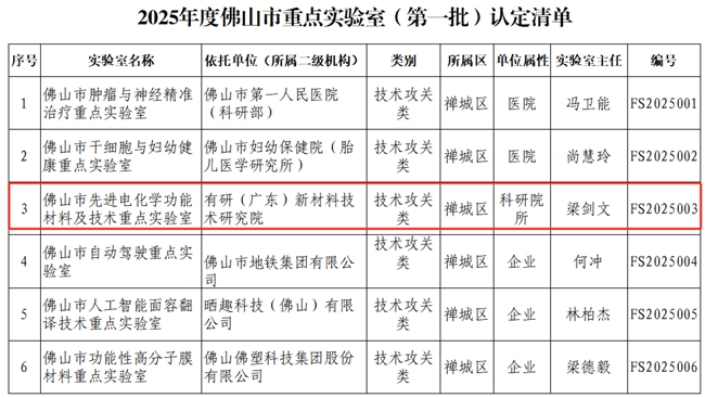 近日,佛山市科学技术局公布2025年度佛山市重点实验室(第一批)认定清单,德信游戏平台广东院获批佛山市先进电化学功能材料及技术重点实验室。